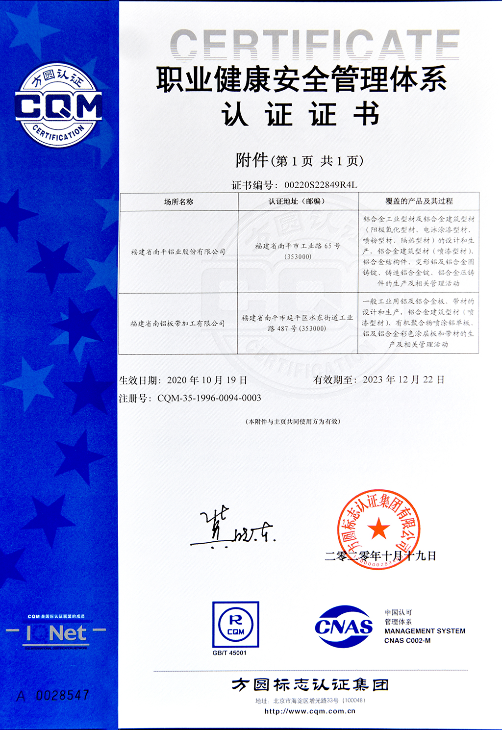 職業(yè)健康安全管理體系認證證書